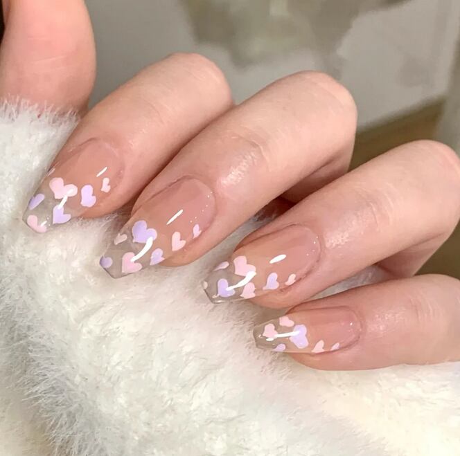 ピンクカラーのクリアネイルにハートのイラストがかわいいネイルチップになります。